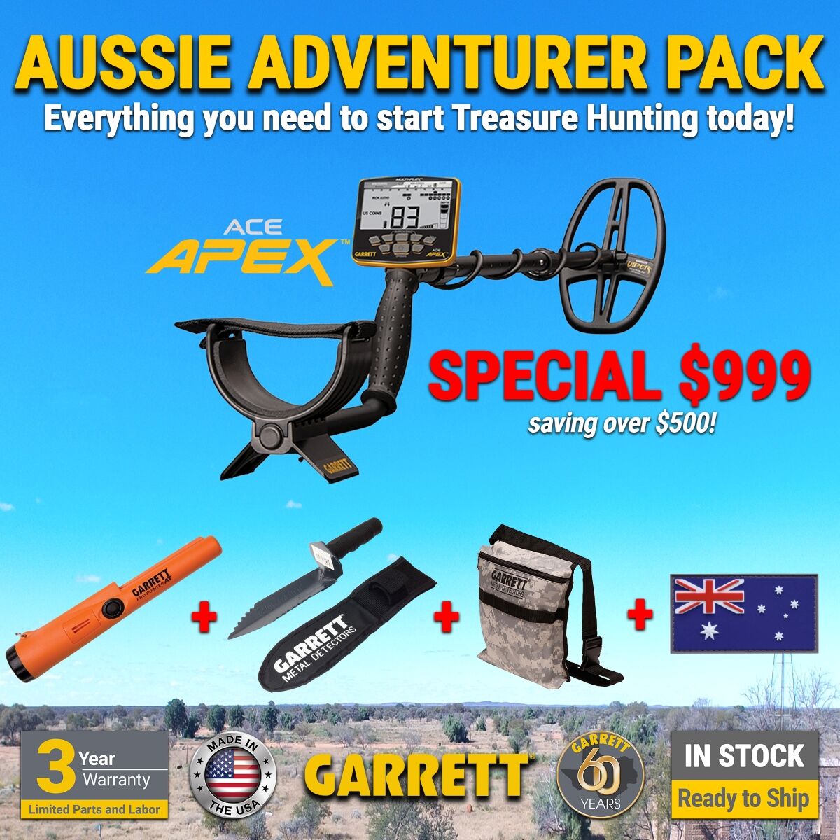 Start your treasure hunting adventure today with the Aussie Adventurer Pack! This all-in-one kit includes the ACE APEX Detector with 6x11" DD Viper Coil, Pro-Pointer AT Pinpointer, Edge Digger Treasure Trowel, Camo Digger's Pouch, and an Australian Flag Velcro Patch – everything you need to uncover hidden treasures from day one.
