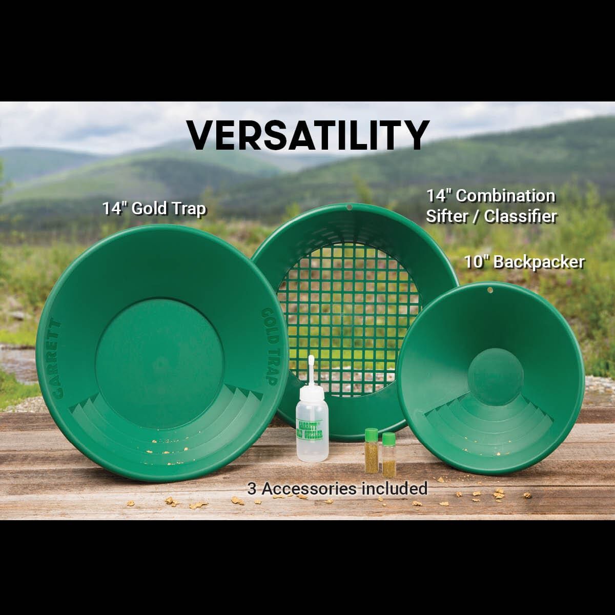Garrett’s world famous Gravity Trap gold pan series has led the industry for 30 years. Garrett’s gold pans feature a 90° riffled design that ensures safe, sure, rapid gold recovery in wet or dry conditions. All Garrett pans are lightweight, green for enhanced gold nugget visibility, and virtually indestructible. Tested and proven worldwide by Charles Garrett, Roy Lagal and tens of thousands of prospectors, Garrett’s gold pans are a must for every recreational and electronic gold seeker.