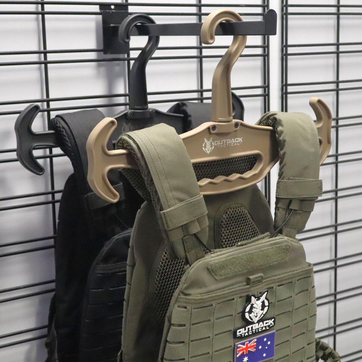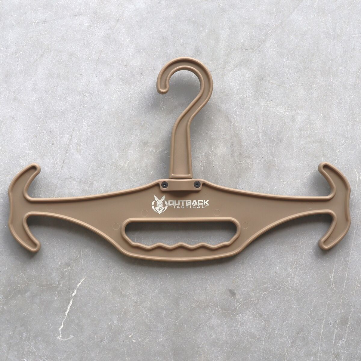 The Outback Tactical Rotating Tactical Hanger is a lightweight Heavy-Duty Hanger that was specially designed to hang, hold, and carry up to 75kg of clothing, heavy equipment, gym equipment, scuba diving gear, camping gear, outdoor sports gear, covert body armour and even tactical load-bearing vests with armour plates. This unique heavy-duty equipment hanger was built for functional and easy storage, inspection and access of your operational equipment.